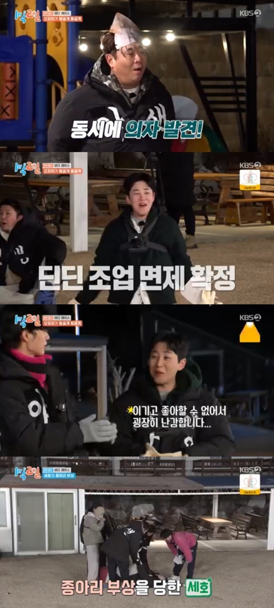 조세호와 딘딘이 최후의 2인으로 남은 가운데 딘딘이 의자에 앉으면서 첫 번째 조업 면제자가 결정됐다.