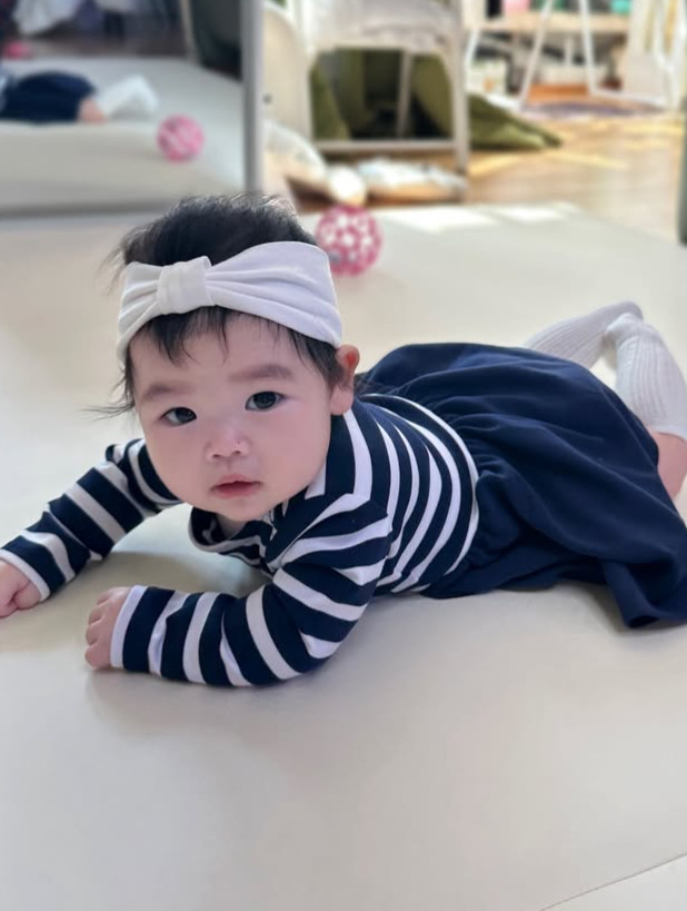뿐만 아니라 얼마 자라지 않은 머리카락 위에 흰색 머리띠까지 착용해 귀여움이 더해졌다. 키즈모델같은 비주얼이 감탄을 더했다.