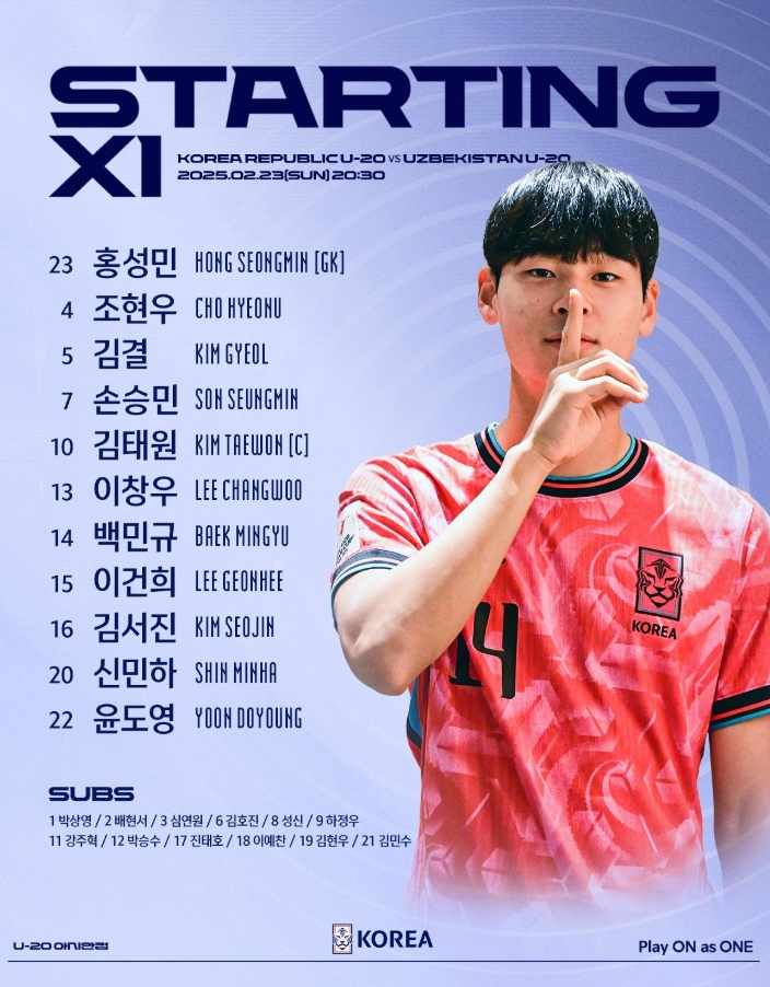 이창원 감독이 이끄는 대한민국 U-20 대표팀은 23일(한국시간) 중국 선전의 유소년 축구 트레이닝 베이스 1경기장에서 열린 우즈베키스탄 U-20 대표팀과 2025 아시아축구연맹(AFC) U-20 아시안컵 8강전에서 1-1 팽팽한 승부를 이어가고 있다.