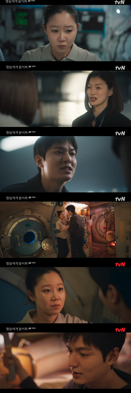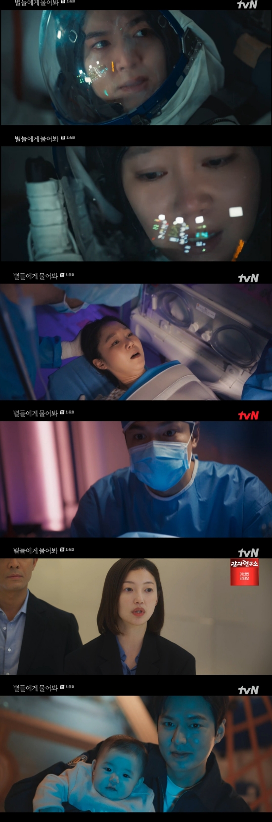 23일 방송된 tvN 토일드라마 '별들에게 물어봐' 16회(최종회)에서는 이브 킴(공효진 분)이 공룡(이민호)와 함께 우주 정거장에서 아이를 낳은 모습이 그려졌다.