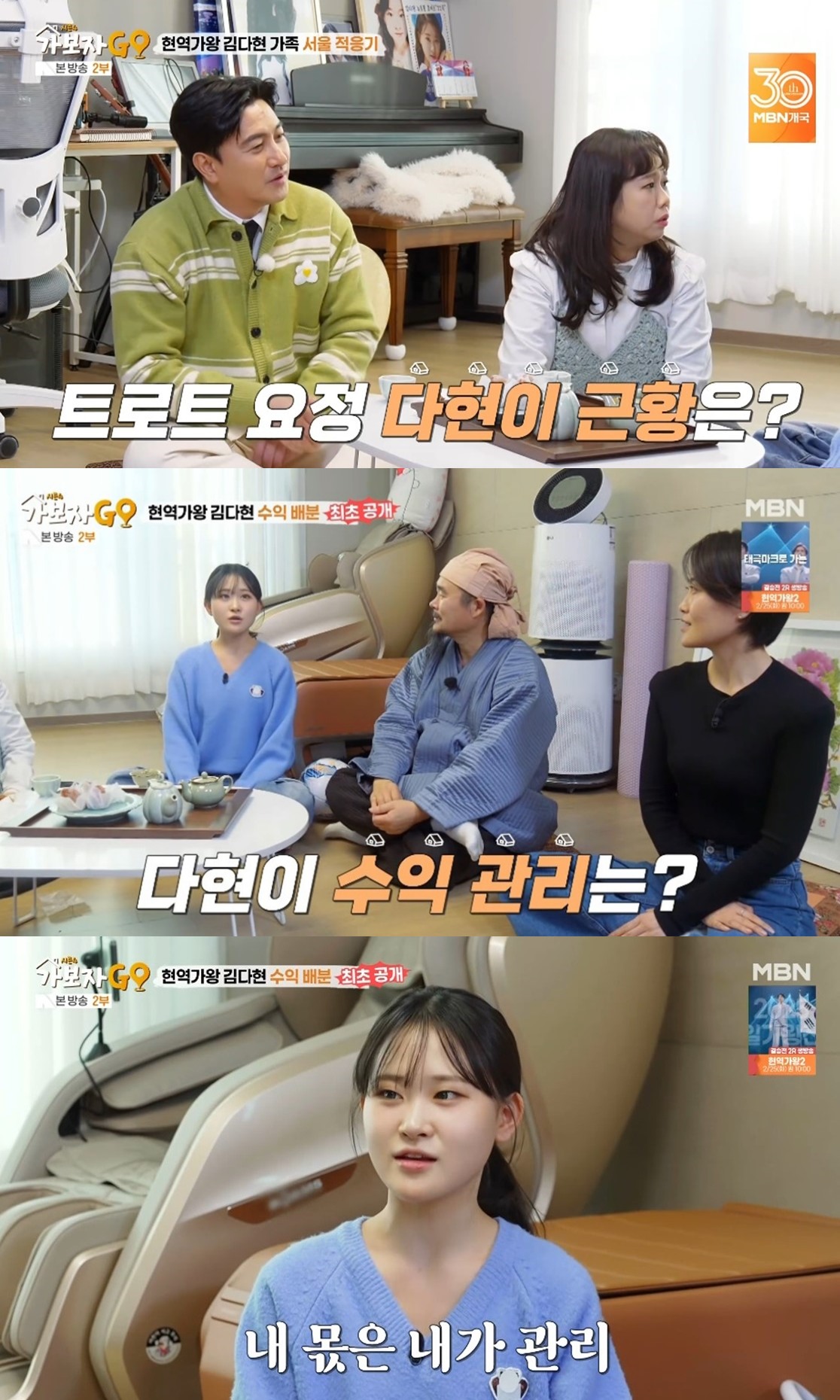 이어 MC들은 부모님과 함께 일하는 김다현에게 “수익 관리는 누가 하는가?”라고 물었고, 김다현은 “내 몫은 내가 관리한다.”라고 똑 부러지게 답했다. MC들은 “가족이라도 금전적인 문제는 굉장히 민감하다”라고 걱정했지만, 김다현의 엄마는 “다현이가 굉장히 철저하고, 자신의 수익을 확실히 챙긴다”라고 답했다.
