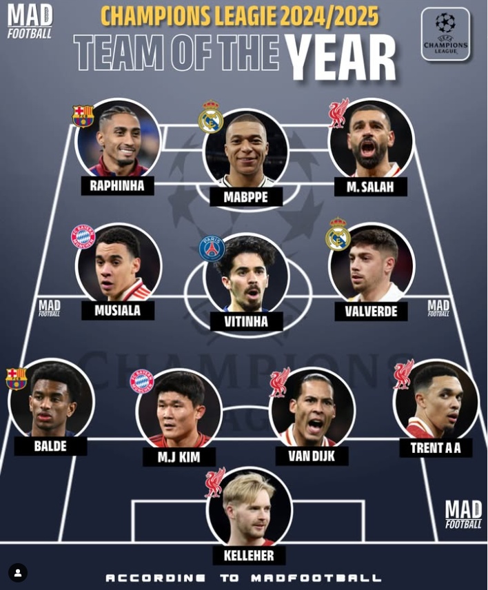 골키퍼 자리는 퀴빈 켈러허(리버풀)가 뽑혔고, 중원엔 자말 무시알라(바이에른 뮌헨), 비티냐(PSG), 페데리코 발베르데(레알 마드리드)가 배치됐다. 최전방 스리톱 라인에 하피냐(바르셀로나), 킬리안 음바페(레알 마드리드), 모하메드 살라(리버풀)가 이름을 올렸다.