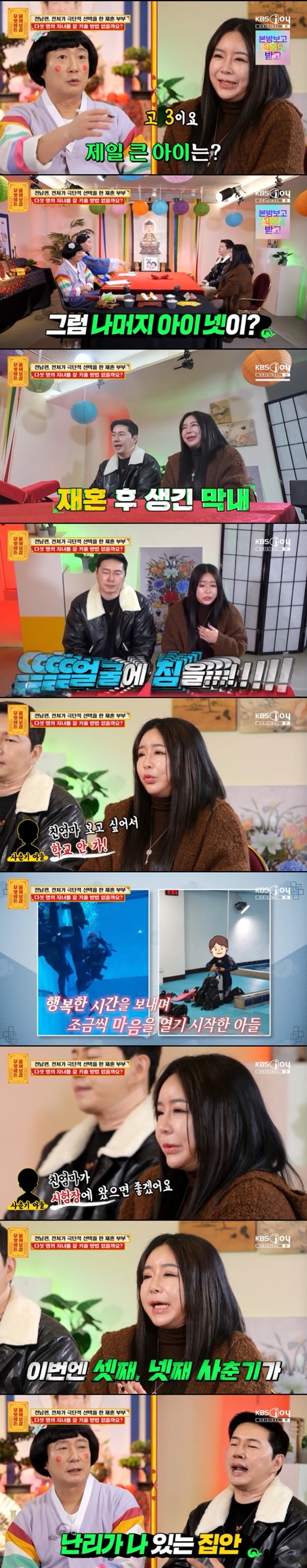 아내는 "큰아들이 사춘기가 왔다. 고1 아들이 6학년 때 사춘기가 어느 정도로 심하게 왔냐면 '이거 해, 저거 해' 하면 내 얼굴에 침을 뱉는다. 엄마 보고 싶어서 학교 안 갈 거라며 등교를 거부했다. 이 아이와 잘 지내고 싶어 물을 좋아해서 스쿠버 다이빙을 가르쳤다. 너무 좋아하더라. 하늘에서 내려온 천사 같다고 나와 같이 스쿠버를 배웠다. 한두 달 과정이었는데 마지막 시험 날 아들이 '엄마 미안한데 우리 엄마가 시험장에 왔으면 좋겠다'라고 하더라. 아이 입장에서 엄마에게 멋진 모습을 보여주고 싶은 걸 이해하는데 나는 서운했다"라고 말했다.