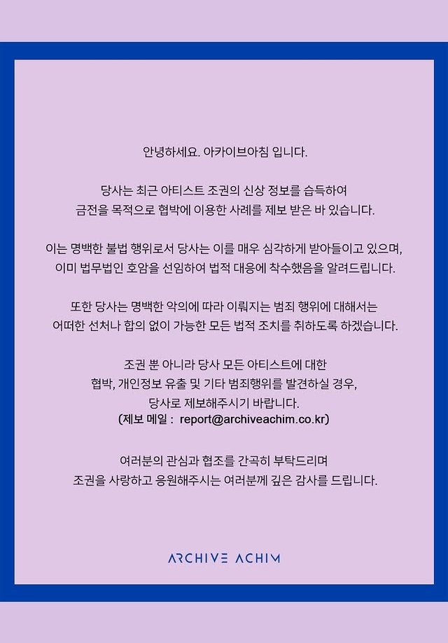 24일 소속사 아카이브아침은 "최근 아티스트 조권의 신상 정보를 습득해 금전을 목적으로 협박에 이용한 사례를 제보 받은 바 있다"라고 알렸다.