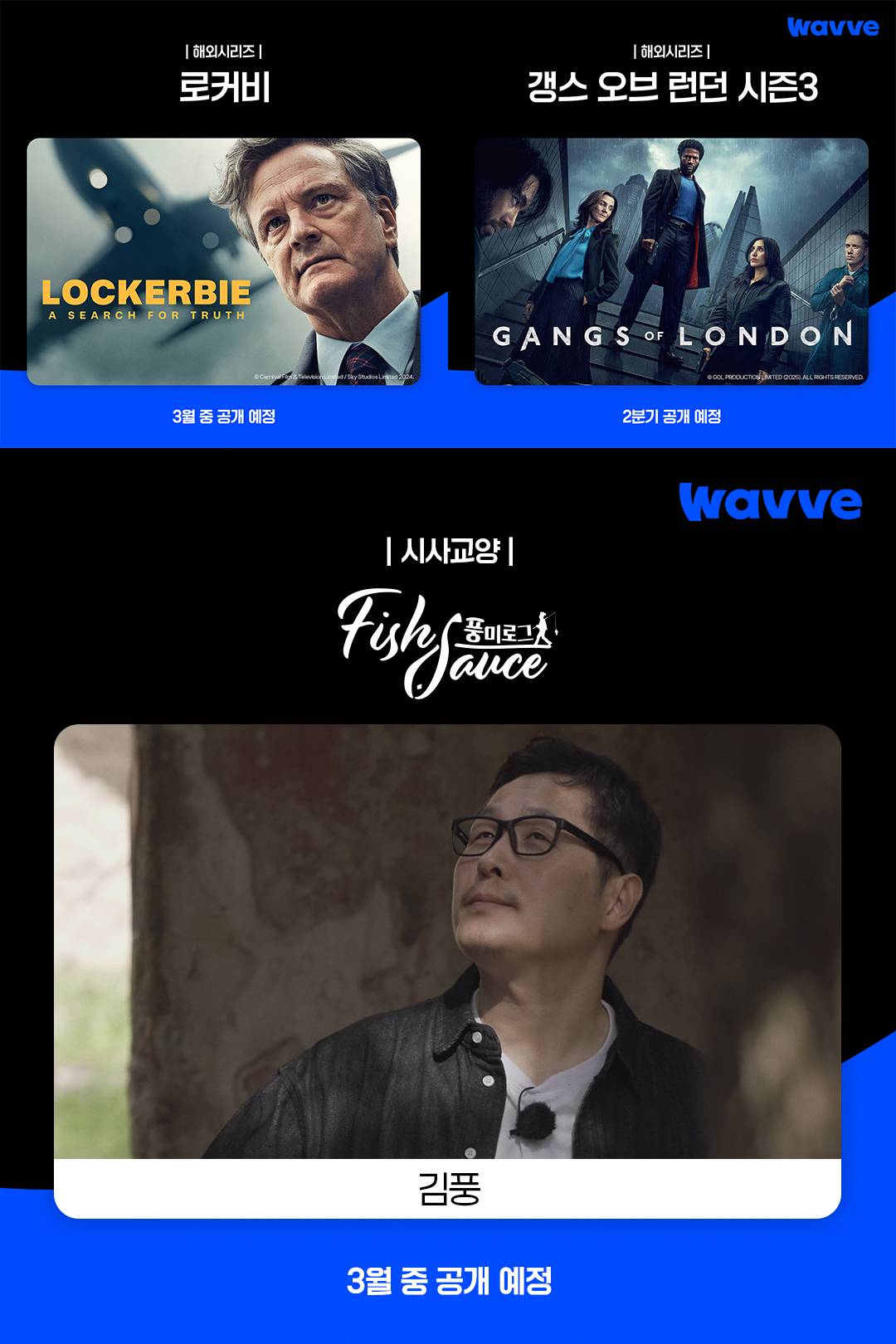 먼저 '갱스 오브 런던' 시리즈는 런던을 지배하려는 범죄 조직들의 이야기를 그린 영국 드라마로, 웨이브에서 시즌1부터 국내 최초 공개되며 많은 시청층을 확보한 바 있다. 이번 시즌에는 김홍선 영화감독이 아시아 감독 최초로 연출을 맡았고, 임주환, 신승환 배우가 출연해 오픈 전부터 기대를 모으고 있다. '로커비'는 세계 항공 참사 중 하나인 팬암 항공 103편 폭파 사건을 다룬 작품이다. 콜린퍼스가 사건으로 딸을 잃은 짐 스와이어 역을 맡아 딸의 죽음의 진실을 찾기 위해 나서는 과정을 그렸다.