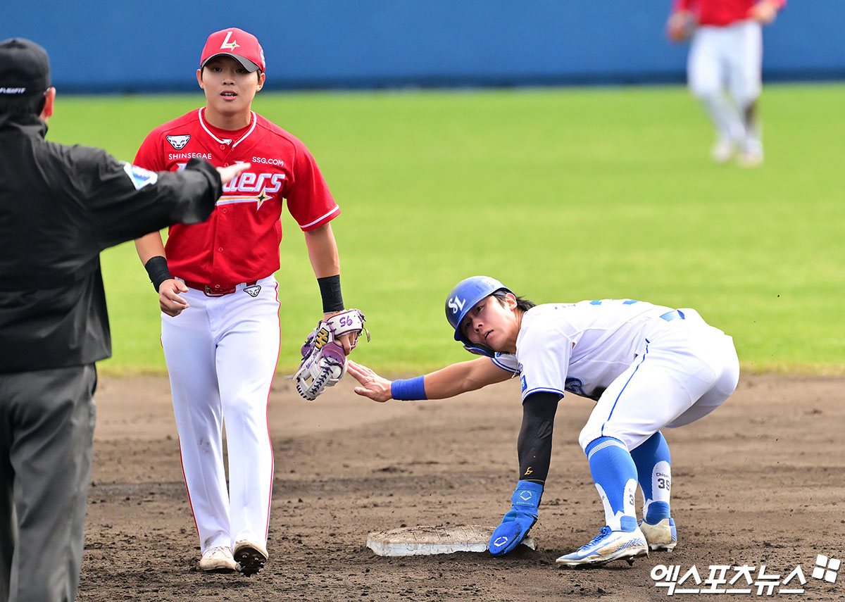 (엑스포츠뉴스 오키나와(일본), 김한준 기자) 25일 오후 일본 오키나와 온나손 구장에서 열린 SSG 랜더스와 삼성 라이온즈의 연습경기, 5회말 무사 1루 삼성 김성윤이 2루 도루에 성공하고 있다.