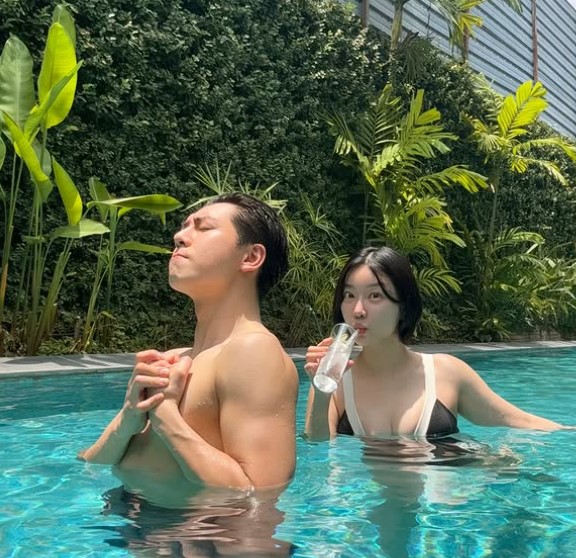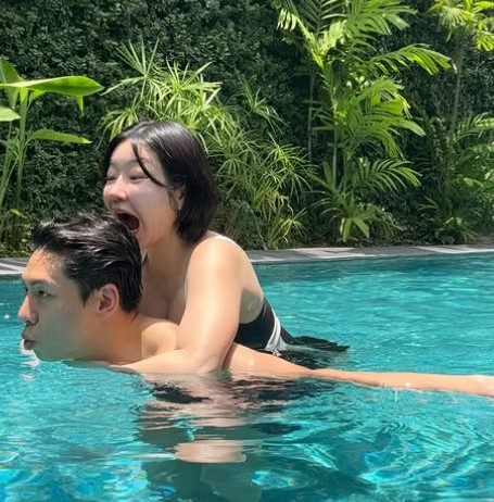 사진 속 레이디제인은 남편 임현태, 뱃속 아기와 함께 발리로 여행을 떠난 모습이다. 블랙 앤 화이트 배색의 수영복을 입은 레이디제인은 임현태 등에 업혀 물장난을 치며 알콩달콩한 시간을 보내고 있다.