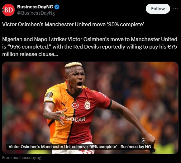 영국 '기브미스포츠' 역시 비즈니스데이NG 보도를 인용, "나이지리아 현지 보도에 따르면, 나폴리의 스트라이커 빅터 오시멘의 맨체스터 유나이티드 이적이 95% 완료된 것으로 전해졌다"고 주장했다.