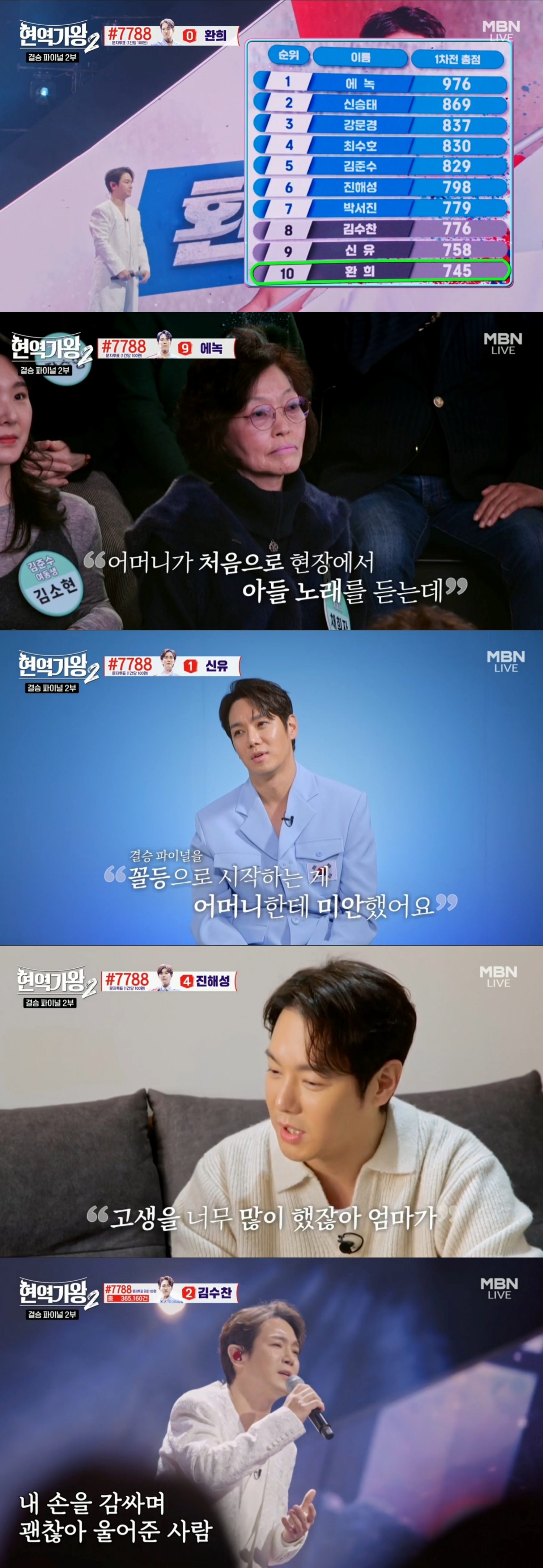 이어 환희는 "이런 생각을 했다. 어머니가 처음으로 방송을 와서 보시는 거고 아들 노래를 현장에서 들으시는 건데, 하필 어머니가 오셨는데 꼴등으로 2라운드를 시작하는 게 어머니께 미안했다"고 고백했다.