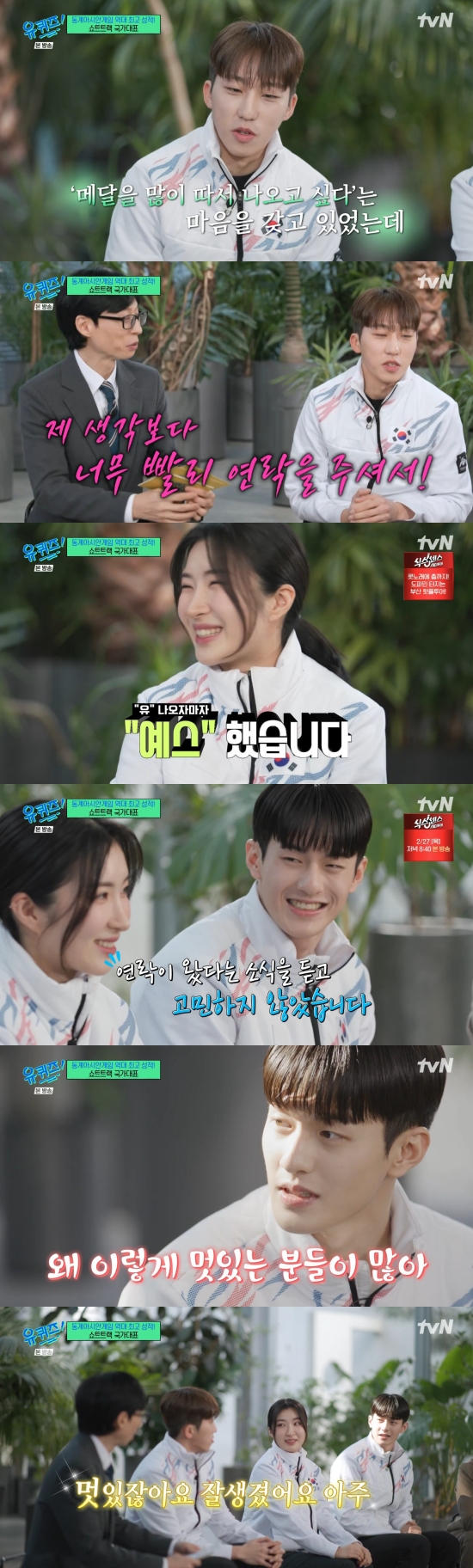 26일 방송된 tvN '유 퀴즈 온 더 블럭'(이하 '유퀴즈')에서는 '신이 내게 주신 것' 특집으로 꾸며진 가운데 쇼트트랙 국가대표 박지원, 김길리, 장성우가 게스트로 출연한 장면이 전파를 탔다.