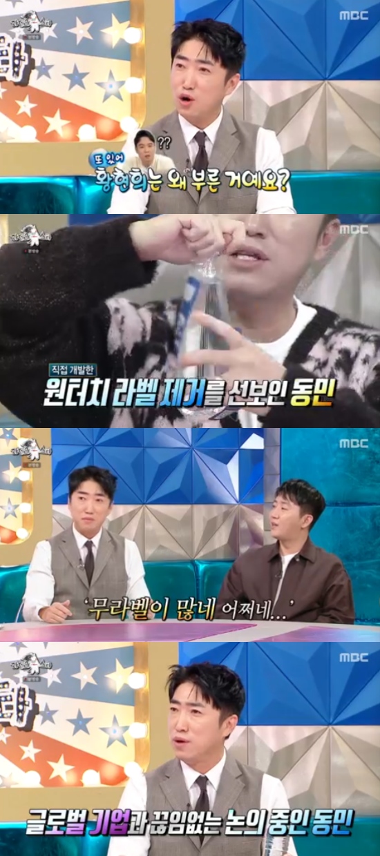 이어 장동민은 "또 황현희는 왜 부른거야? 투자 이런 얘기 하면서 내 얘기를 했더라"면서 장동민이 만든 음료 뚜껑을 열면서 저절로 라벨지가 벗겨지는 상품을 언급했다. 당시 황현희는 "요즘 무라벨이 나온다"고 하기도.