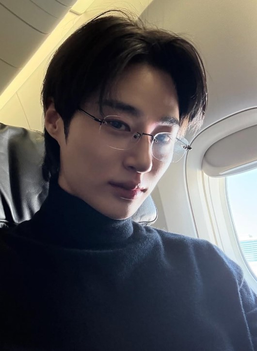 사진 속 변우석은 밀라노 패션위크 참석 차 이탈리아로 떠난 모습. 변우석은 비행기 창가에 앉아 안경을 쓰고 지적인 매력을 뽐내고 있다.