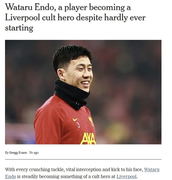 '디 애슬레틱'은 지난달 29일 "많은 기회를 받지 못하는 엔도 와타루를 리버풀 팬들이 좋아하는 이유"라는 주제의 기사를 공개했다.