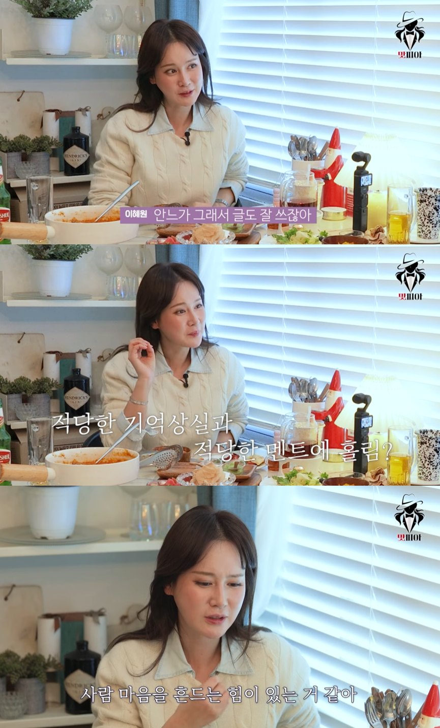 이어 이혜원은 "누군가 나한테 '결혼 유지법이 뭐냐'고 묻는다면, 적당한 기억상실과 적당한 멘트의 홀림"이라고 답할 거 같다고 말했다.