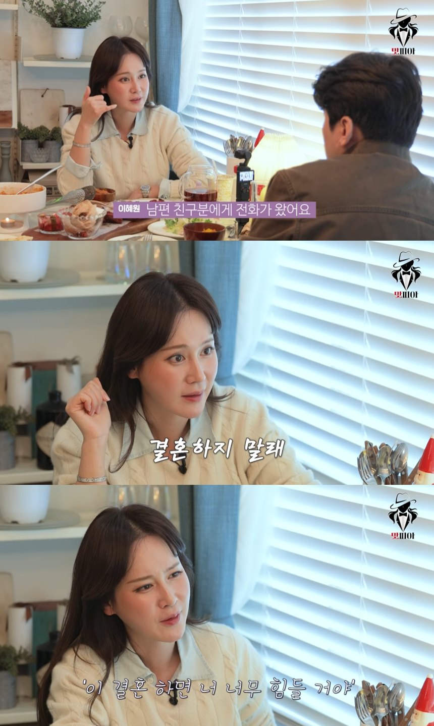이후 이혜원은 결혼식 전날 안정환의 친구들에게 결혼을 만류당했던 에피소드도 밝혔다. 이혜원은 “결혼식 전날 남편의 친구한테 전화가 왔다”며 “내일 신부 화장을 하고 결혼식 해야 해서 자야 하는데, 새벽에 전화가 온 거다. 정말 친한 친구였다”고 회상했다.