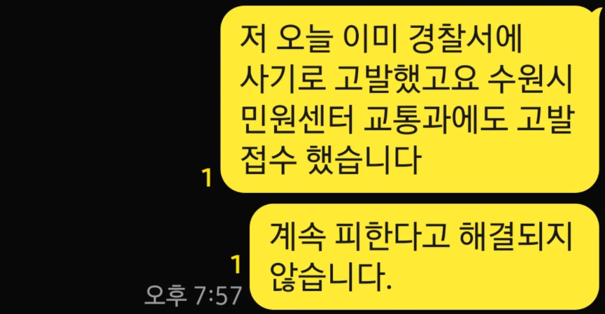 사진 속 한정수는 "계속 이렇게 연락 피하실 거냐"면서 "이미 경찰서에 사기로 고발했고, 수원시 민원센터 교통과에도 고발 접수했다. 계속 피한다고 해결되지 않는다"고 중고차 딜러에게 연락을 보냈다. 그러나 대화 상대방인 중고차 딜러는 해당 메시지를 확인하지 않은 것으로 보인다.
