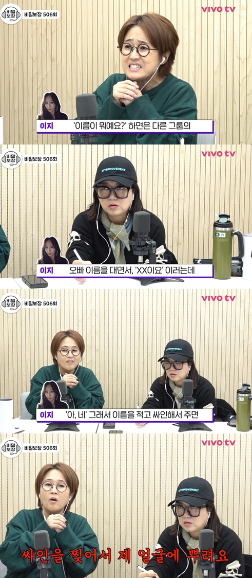 이지는 "(단체로 짜서) 각자 오빠들 이름을 대니까 우리도 당황했는데 어떻게 할 수가 없었다. 근데 갑자기 그걸 찢어서 동시에 얼굴에 확 뿌리니까"라고 자세히 설명하며 송은이, 김숙의 할말을 잃게 만들었다.