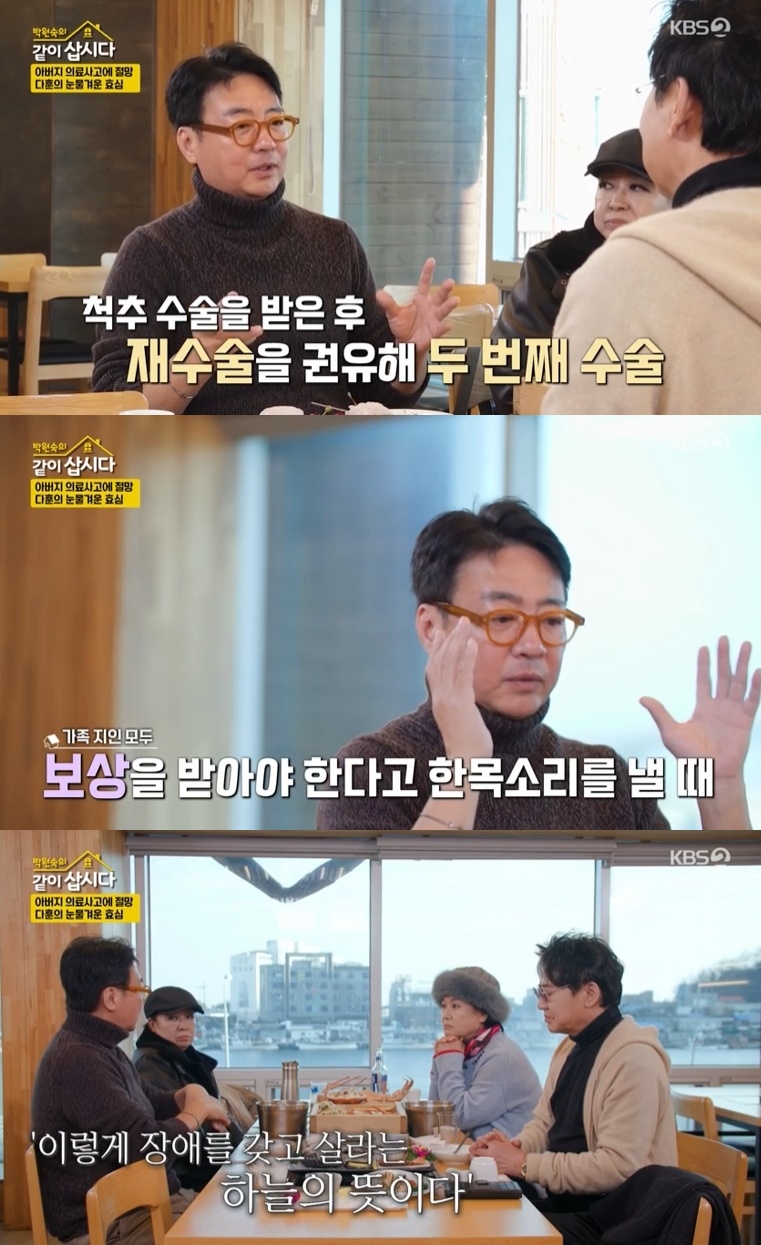 이어 "70년대 중반 정도에 아버지가 척추 수술을 받았다. 재수술을 권유하길래 두 번째 수술을 받았는데 수술 중 왼쪽 다리 신경이 끊기는 의료사고를 당했다"고 토로했다.