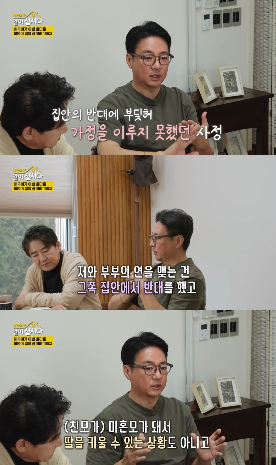 윤다훈은 "낳아준 엄마가 어쩔 수 없이 떠났고, 상대방 집에서는 나를 반대해 결혼이 성사되지 않았고, 나와 부부의 연을 맺는 걸 그쪽에서 반대했다"고 담담히 털어놨다.