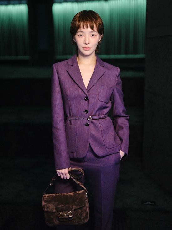 박규영은 퍼플 컬러 슈트 셋업과 트렌디한 숏컷 헤어 스타일링을 선보였다.