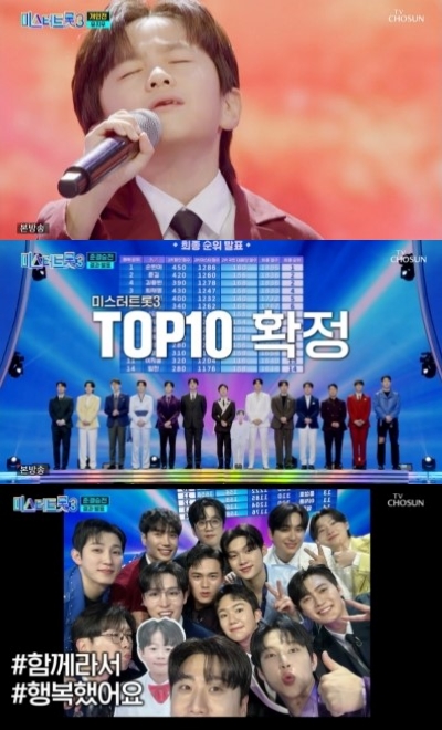 손빈아(1위), 김용빈(2위)-춘길(2위), 최재명(4위), 추혁진(5위), 박지후(6위), 남승민(7위), 유지우(8위), 남궁진(9위), 천록담(10위) 최종 TOP10이 확정됐다. 강훈(11위), 홍성호(12위), 이지훈(13위), 임찬(14위)은 탈락했다. 이들 중 결승전 무대에 설 TOP7은 누가 될까. 라운드를 거듭할수록 서바이벌의 쫄깃한 묘미와 팬덤 화력이 치솟고 있는 ‘미스터트롯3’는 매주 목요일 오후 10시 방송된다.