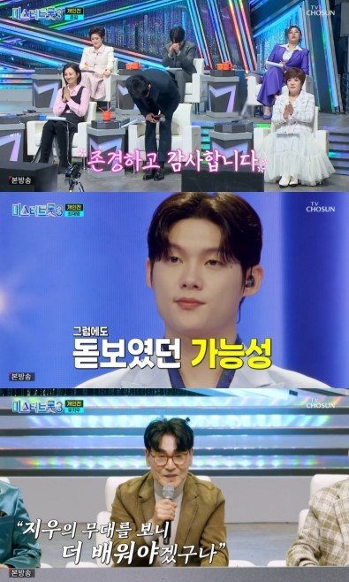 한편 ‘미스터트롯3’ 막내 유지우는 순수한 감성으로 어른들의 마음을 어루만졌다. 세상에서 가장 좋아하는 가수가 조항조라는 유지우는 이날 조항조의 ‘돌릴 수 없는 세월’을 선곡했다. 엄마를 생각하며 담담하게 노래 부른 유지우는 타고난 음악성으로 소름을 유발했다. 조항조는 “다른 어떤 가수보다, 원곡자보다 더 잘 불렀다”라며 “유지우를 보면서 다시 노래를 배워야겠다 생각했다. 정말 잘했다”라며 최고의 찬사를 보냈다.