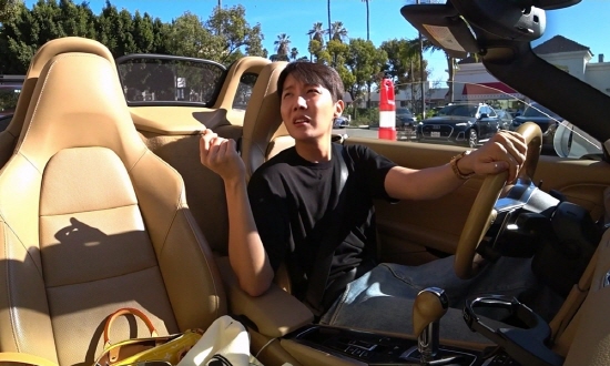 제이홉이 오픈카를 타고 L.A 도심을 달리며 낭만 가득한 드라이브를 즐긴다. 이어 그가 도착한 곳은 ‘드라이브 스루’가 가능한 햄버거 가게다.