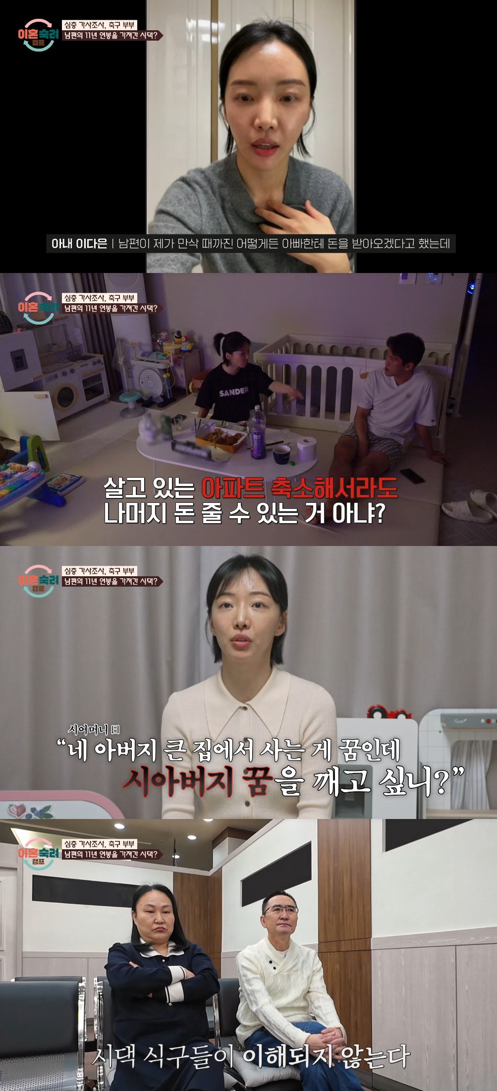 아내는 "시부모가 둘이서 50평대 아파트를 산다"며 "남편도 처음에는 둘이 사는 거니까 평수 줄여서 집 팔고 나머지를 자기 달라고 했는데 아버님이 집 못 판다고 했다"고 이야기했다.