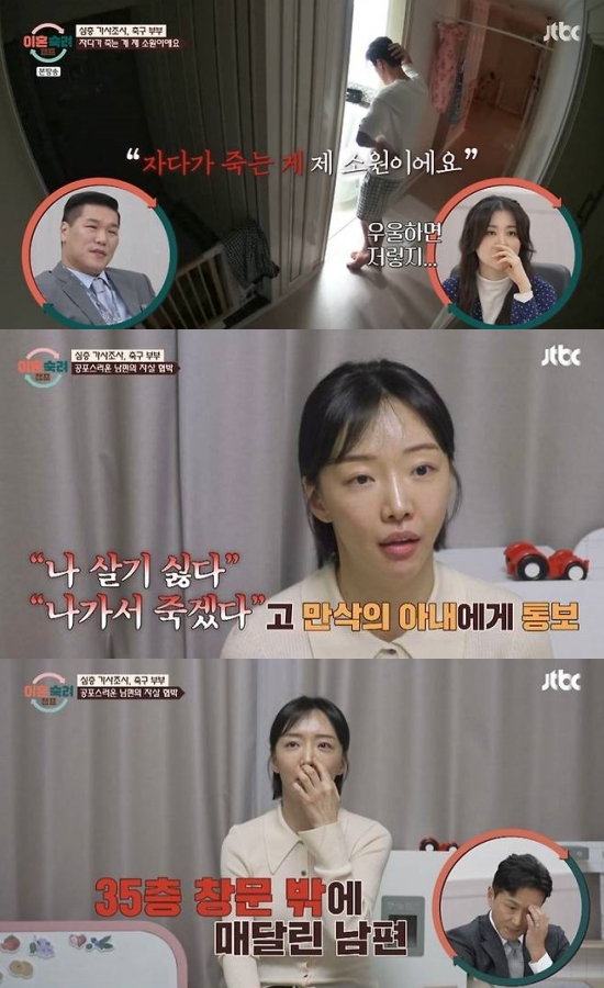 이다은은 "남편이 금전적 스트레스를 받으면 '살기 싫다'는 식으로 말한다. 내가 만삭일 때도 그랬다. 아이가 100일이 안 됐을 때도 욱해서 '똑바로 봐'라며 35층 창문 밖에 매달렸다. 충격이 너무 컸다"고 눈물을 보였다.
