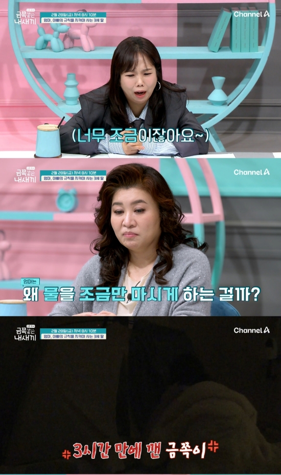 선공개 영상에서는 금쪽이네의 저녁 식사 시간이 포착된다. 밥을 먹던 금쪽이가 목이 마르다며 물을 찾자, 엄마의 표정이 굳어지더니 극소량의 물만 따라준다. 금쪽이가 급하게 물을 들이켜자, 엄마는 단호한 목소리로 “그게 마지막 물이야. 더 못 마셔요”라고 말하며 금쪽이가 마시는 물까지 철저하게 통제한다.
