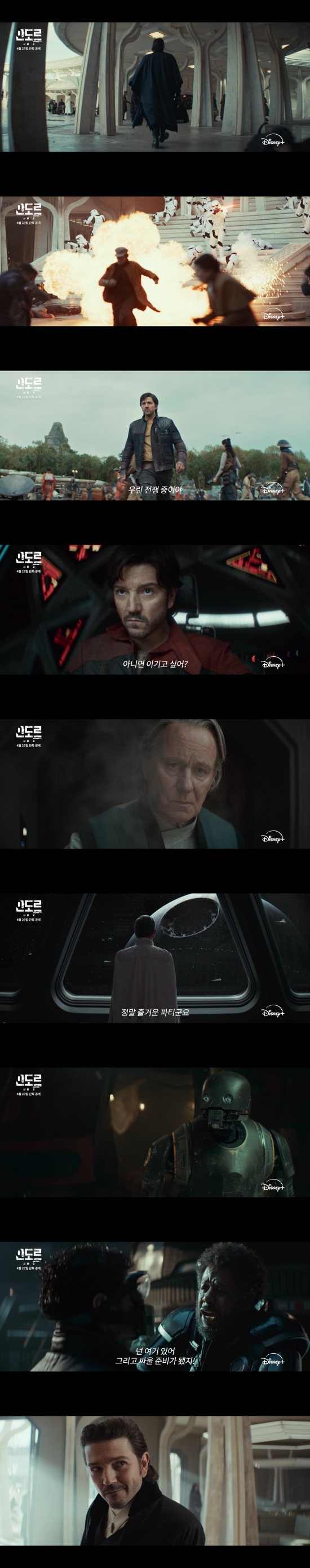 하지만 곧이어 데스 스타의 제작을 지켜보고 있는 제국의 오슨 크레닉(벤 멘델슨) 국장이 등장, 심상치 않은 위협이 그들에게 다가옴을 암시하며 긴장감을 자아낸다. 무자비해지는 제국의 억압과 이에 맞선 반군 연합의 대립은 심화되고, “지금 이 순간을 기억해라! 넌 여기 있어. 그리고 싸울 준비가 됐지!”라는 반군 쏘우 게레라(포레스트 휘태커)의 외침은 본격적인 혁명이 시작될 것임을 알리며 전율을 선사한다. 배신과 희생, 갈등 등 온갖 위험이 난무하는 상황 속 안도르가 과연 데스 스타의 존재를 깨닫게 될지, 은하계의 운명을 뒤바꿀 수 있을지 호기심이 증폭된다.