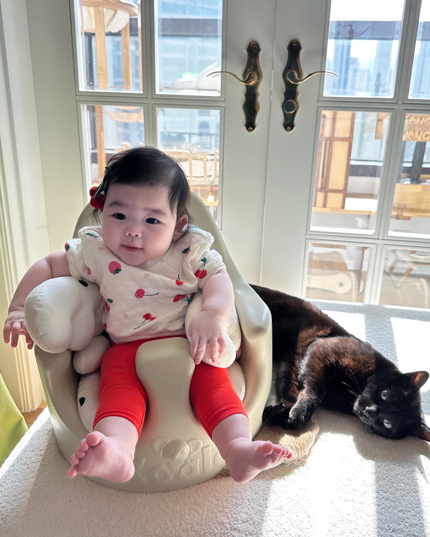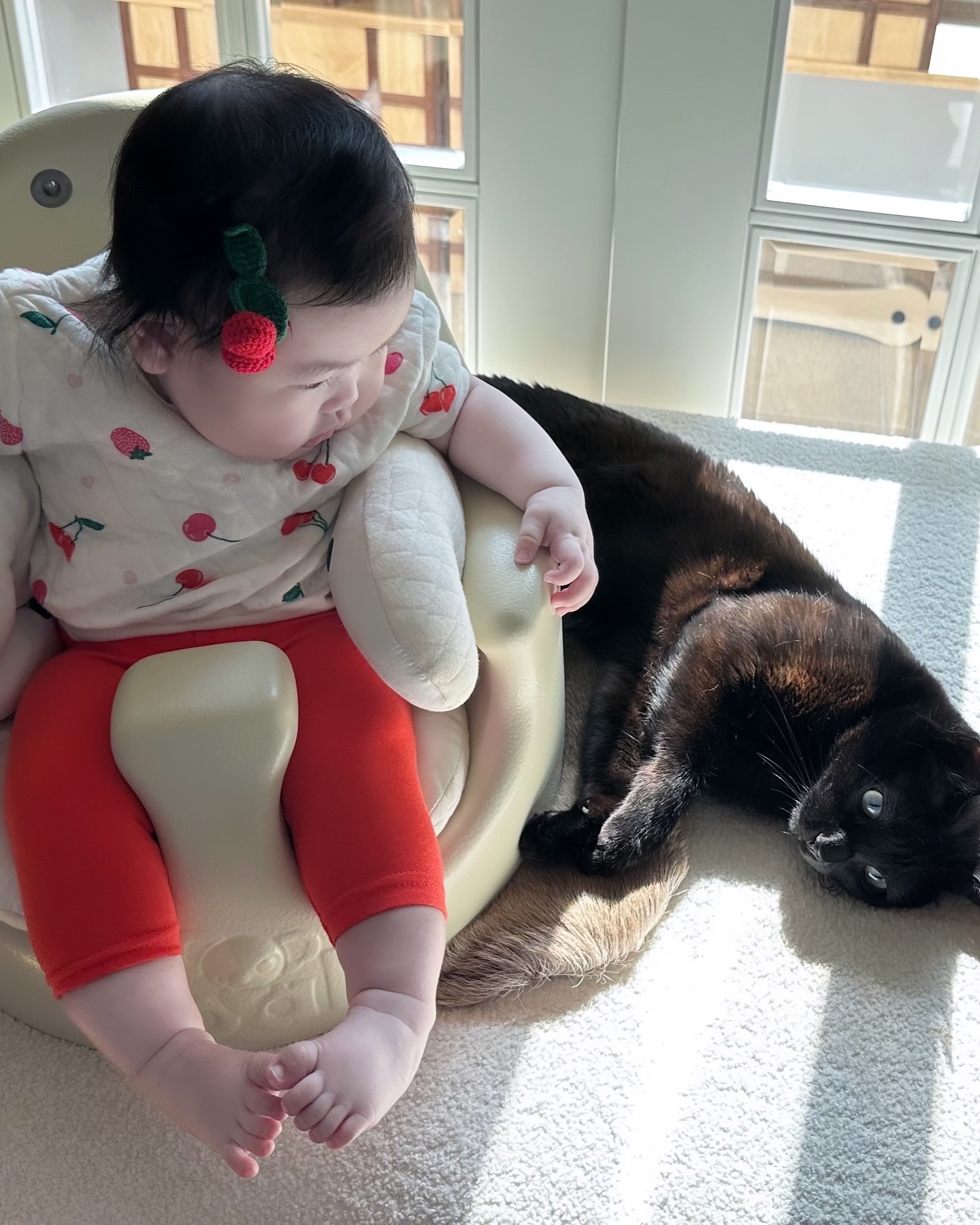 사진 속에는 창가에서 따뜻한 햇볕을 만끽하고 있는 딸 재이와 고양이 다홍이의 모습이 담겨 있다. 엄마 아빠의 쏙 빼닮은 귀여운 외모의 재이와 그 옆에서 벌러덩 누워있는 다홍이가 눈길을 끈다.