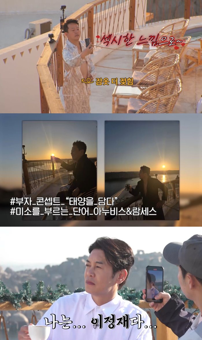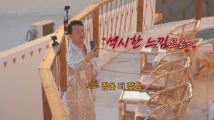 눈앞에 펼쳐진 나일강과 강 너머로 보이는 ‘필레 신전’ 뷰, 그리고 아름다운 일출에 감탄한 김준호는 입을 다물지 못한다. 그러더니 곧장 파자마 차림으로 셀카를 찍는다. 나아가 그는 “여유로운 부자 느낌으로 찍고 싶다”며 유세윤에게 사진 촬영을 부탁한 뒤, 파자마 상의를 풀어 헤치는 ‘파격 노출’을 선보인다.