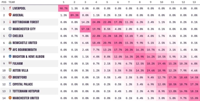 리버풀 팬들이 환호할만한 소식이다. 반대로 다른 구단 팬들은 절망적인 소식이다. 먼저 2위 아스널의 이번 시즌 리그 우승 확률은 1.3%다. 그 밑에 노팅엄(3위), 맨시티(4위) 등 다른 팀은 0%다. 리버풀은 대관식만 남겨뒀다고 해도 과언이 아니다.