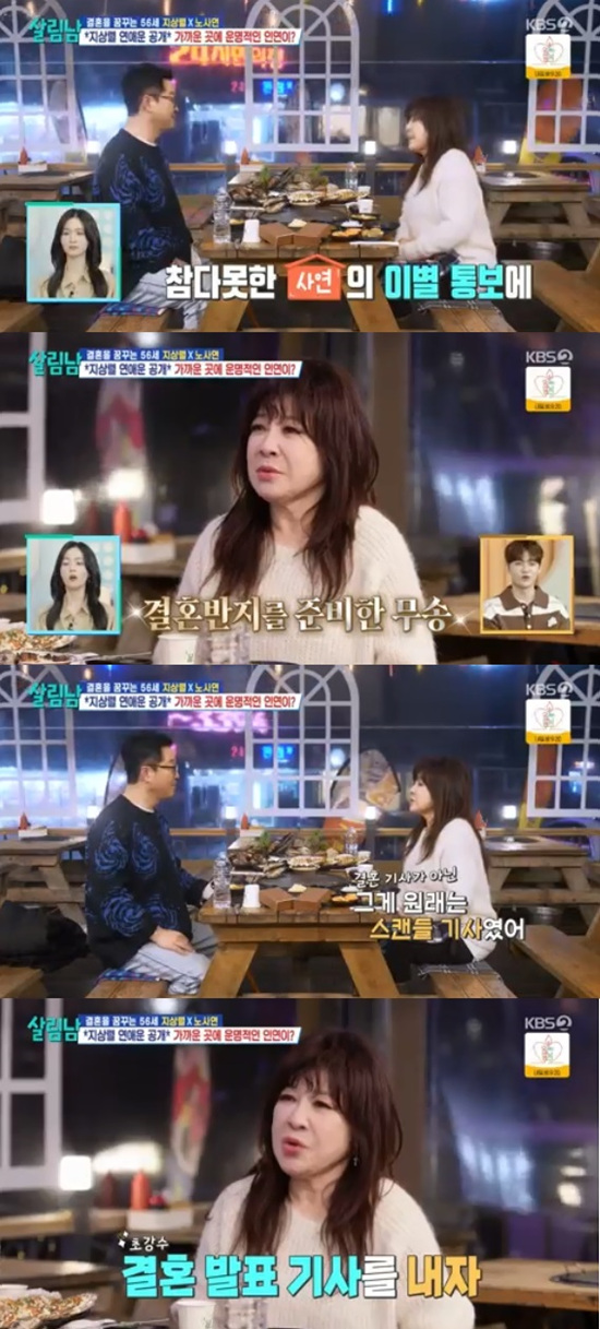 노사연은 신문에 결혼 기사가 났었는데 원래는 스캔들 기사로 나는 거였다고 비화를 공개했다.
