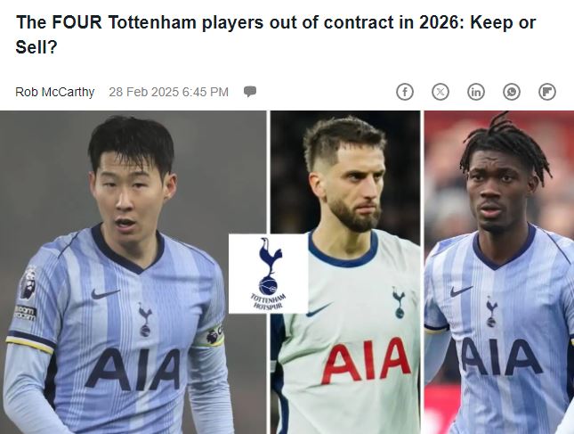 매체는 "이 여름에 그를 매각하더라도 이적료가 많지 않을 것이다. 손흥민은 7월에 33세가 되며, 경기력 역시 하락세를 보이고 있다"며 손흥민이 당장은 팀에 남아야 한다고 주장했지만, 2026년 여름에는 자유 계약으로 방출해야 한다며 자신들의 주장을 늘어놓았다.