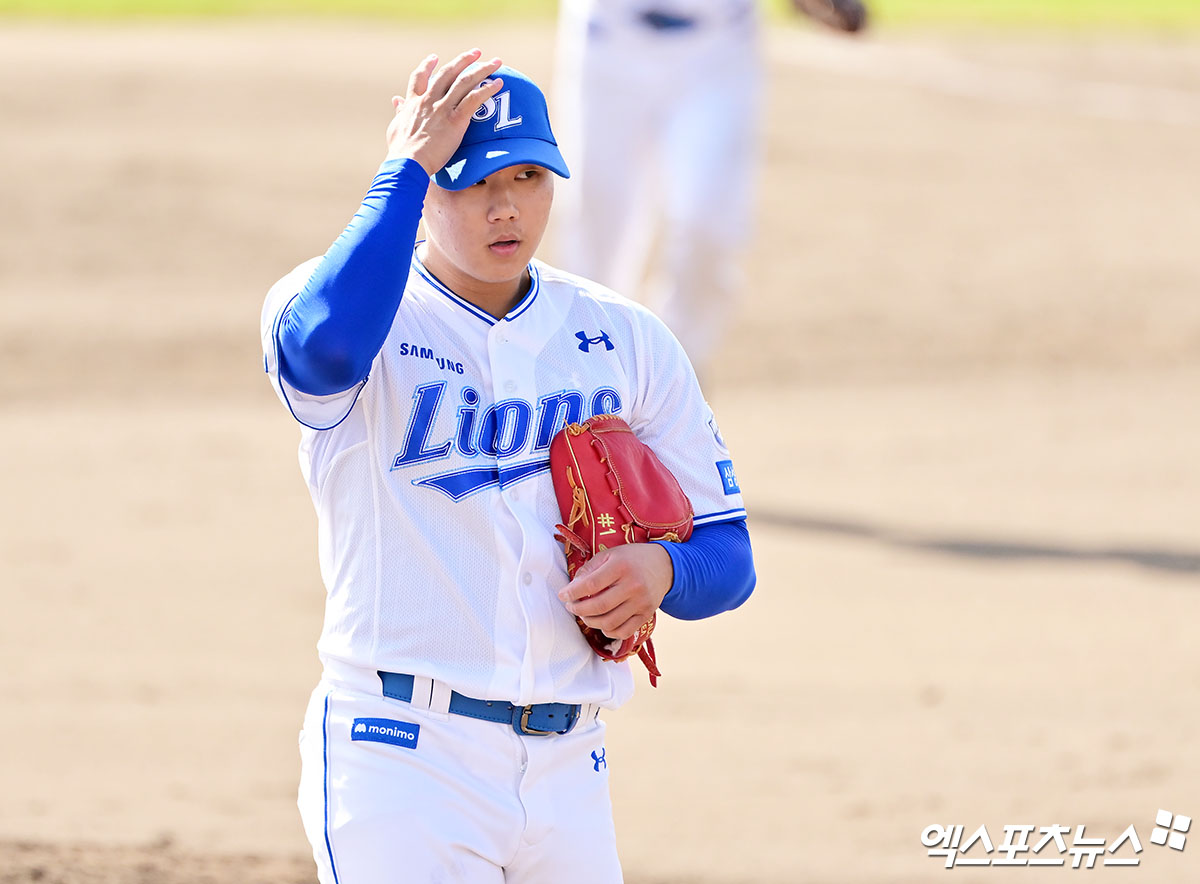(엑스포츠뉴스 오키나와(일본), 김한준 기자) 2일 오후 일본 오키나와 온나손 아카마 구장에서 열린 KIA 타이거즈와 삼성 라이온즈의 연습경기, 7회초 수비를 마친 삼성 배찬승이 더그아웃으로 향하고 있다.