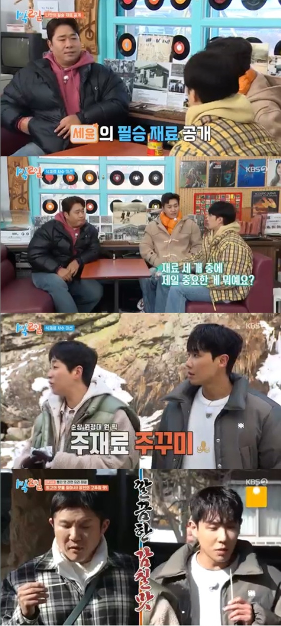 유선호는 손질된 닭 한 마리를 보여줬고 김종민은 참치캔 2개를 꺼냈다. 문세윤은 어머니가 직접 짠 들기름을 가져왔다고 했다.