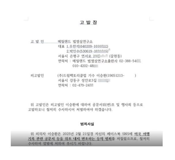 공개된 사진은 이승환의 고발장으로 고발인은 이승환에 대해 "공문서위(변)조 및 행사죄 등으로 고발한다"며 "미국 여행 기록 관련 공문서 등을 위조 내지 변조하는 등의 범죄를 저질렀다"고 주장했다.