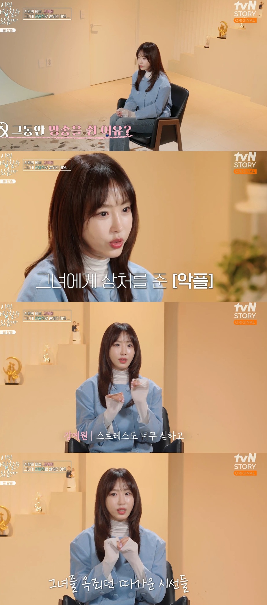 이어 강예원은 그간 방송 활동을 쉰 이유을 묻자 "이전에는 맨날 울었다. 댓글 보고 울고 그랬다. 저 상처 진짜 잘 받는다. 크게 받는다. 남들은 요만큼 받는 걸 저는 엄청난 타격이 있다"고 털어놨다.