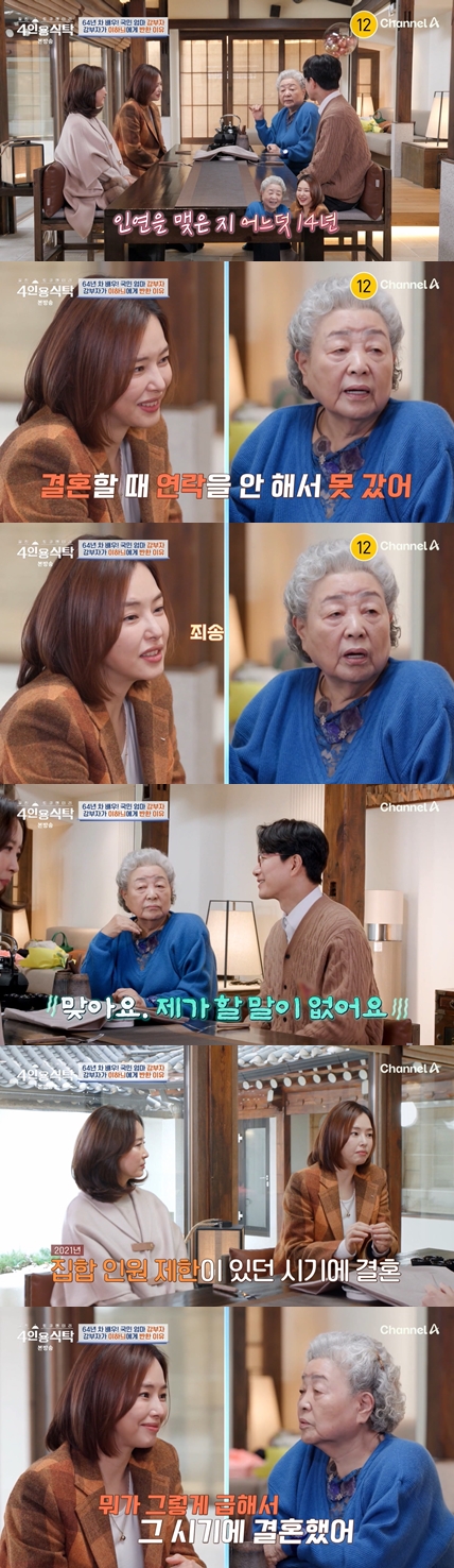 3일 방송된 채널A '절친 토큐멘터리 – 4인용식탁'(이하 '4인용식탁')에서는 국민배우 강부자가 북촌의 한 한옥으로 절친 윤유선, 조우종, 이하늬를 초대해 4인용식탁을 꾸렸다.