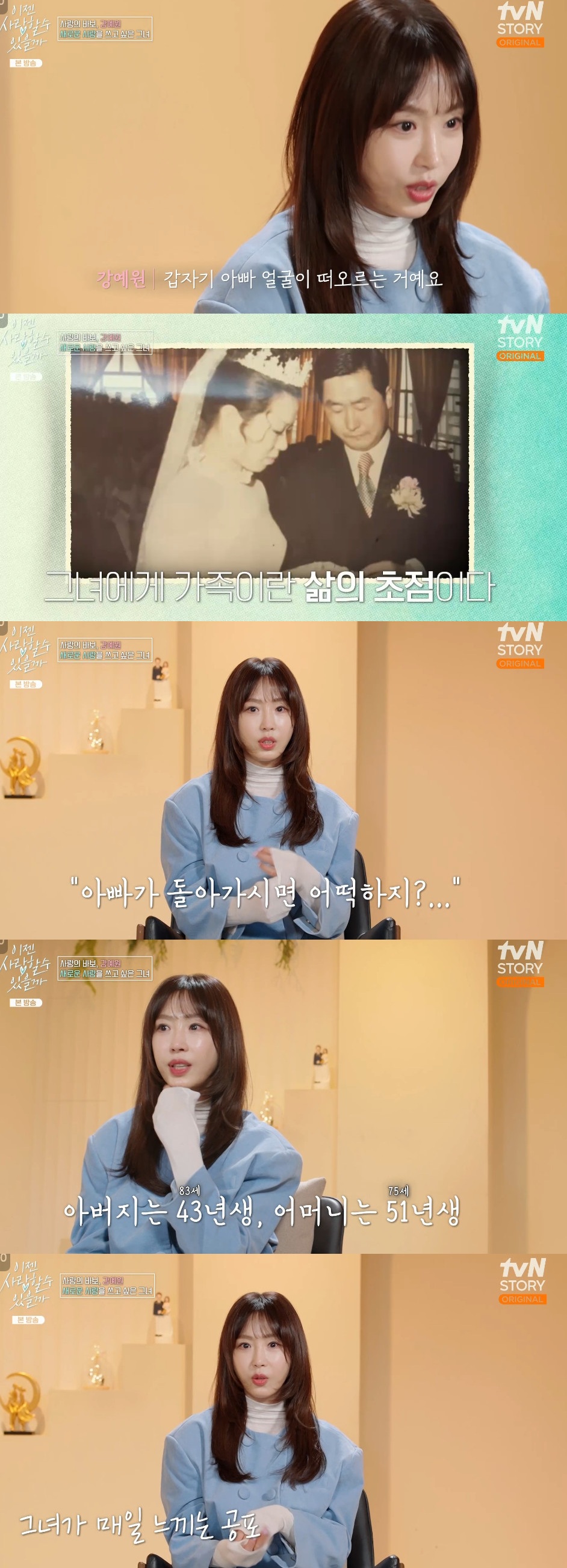 강예원은 나이가 많으신 부친을 생각하며 "사실 요즘 밤에 잠들 때마다 공포가 있다. '아빠가 돌아가시면 어떡하지?'라는 생각이 밤마다 느껴진다"고도 전했다.