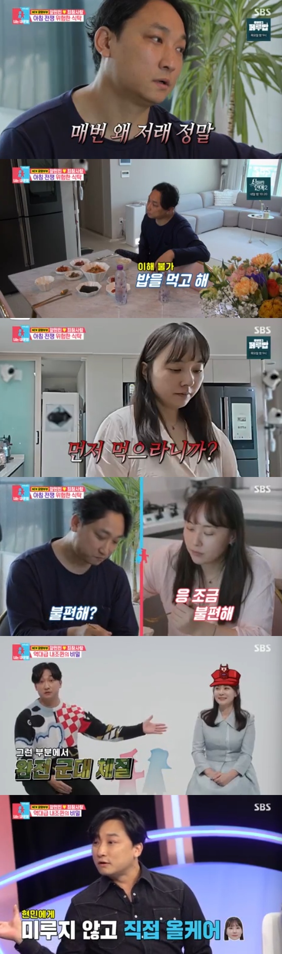 양현민은 "다 먹고 나서 정리를 해도 되는 것 아니냐"면서 아내의 행동을 못마땅하게 여겼다. 하지만 최참사랑은 아랑곳하지 않고 식기 정리부터 음식 소분까지 모두 마치고서야 식탁에 앉았다.