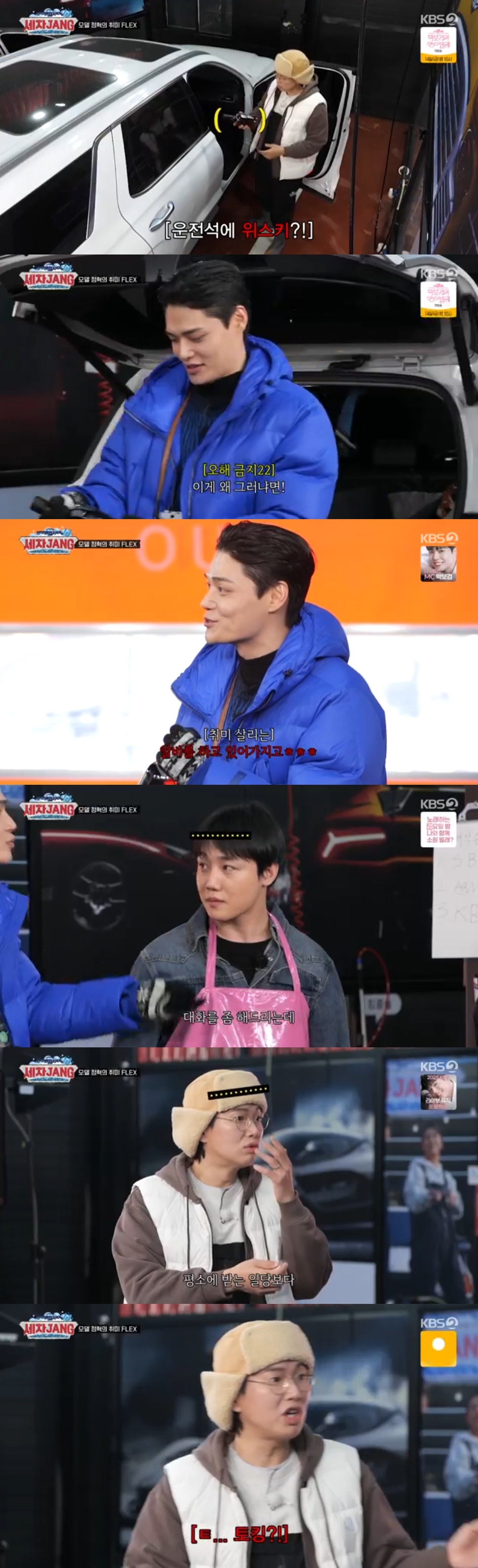 이어 차 내부를 살피던 장성규는 운전석 옆에 꽂혀있는 위스키 병을 살피며 "얘 큰일이다. 운전석에 위스키 있다"고 폭로했다.