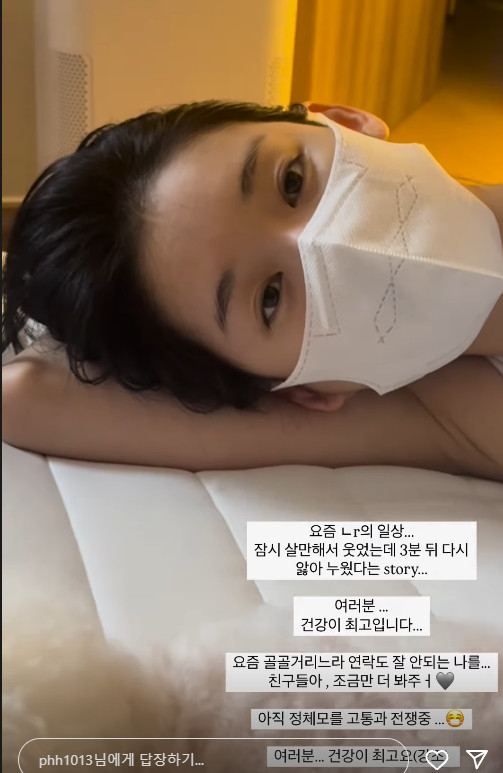 4일 박환희는 자신의 개인 계정을 통해 "요즘 나의 일상 잠시 살만해서 웃었는데 3분 뒤 다시 앓아 누웠다는 story..."라는 글과 함께 영상을 게재했다. 공개된 영상 속 박환희는 마스크를 쓴 채 기력없는 모습으로 카메라를 응시하고 있다.
