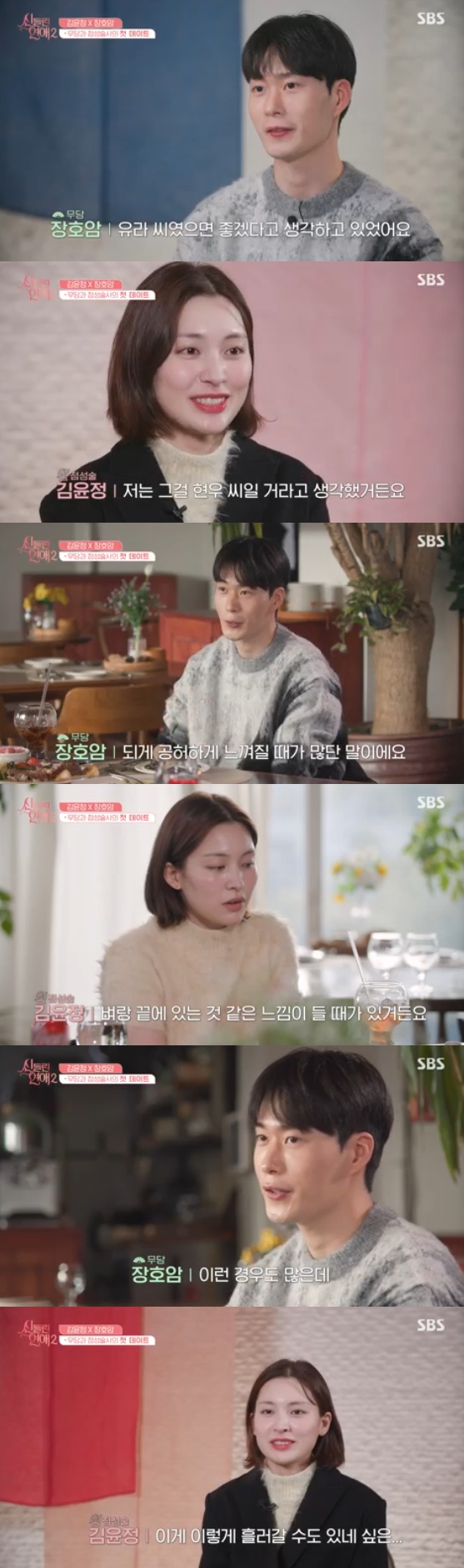 두 사람은 깊은 이야기를 자연스럽게 나눴다. 처음엔 호감이 없는 상대였지만, 대화를 나누면서 서로에게 호감도가 높아졌다. 김윤정은 "대화가 편했다. 되게 빨리 가까워진 느낌이었다"고 했다.