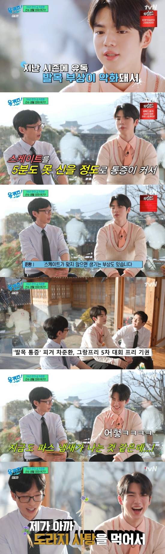 5일 방송된 tvN '유 퀴즈 온 더 블럭'(이하 '유퀴즈')에서는 '꿈은 이루어진다' 특집으로 꾸며진 가운데 차준환 선수가 발목 부상에 대해 언급한 장면이 전파를 탔다.