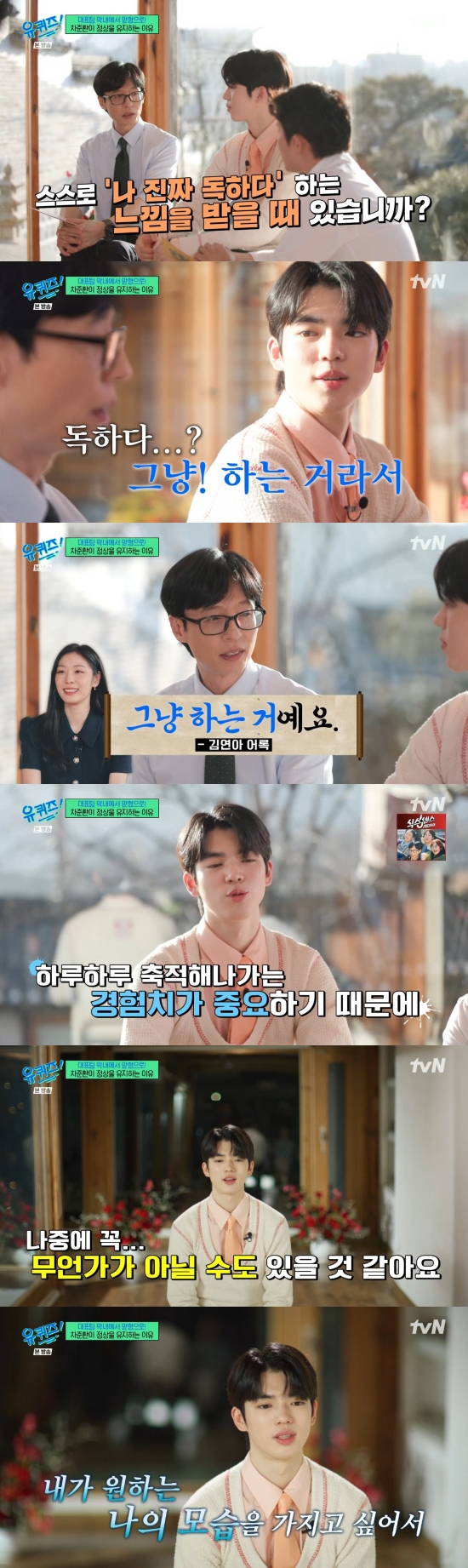 유재석은 "김연아 선수도 똑같은 이야기를 했다. 너무 많은 생각을 하게 되면 오히려 이 일에 대해서 내가 어떤 날은 하기 싫기도 하고 이러니까 그래서 생각이 없어지고 '내가 오늘 해야 되는 일' 이렇게 생각하는 게 아닐까 생각이 드는데 어떻냐"라며 거들었고, 차준환 선수는 "운동이기도 하고 하루하루 축적해나가는 경험치가 중요하기 때문에 그렇게 하는 거 같다"라며 전했다.