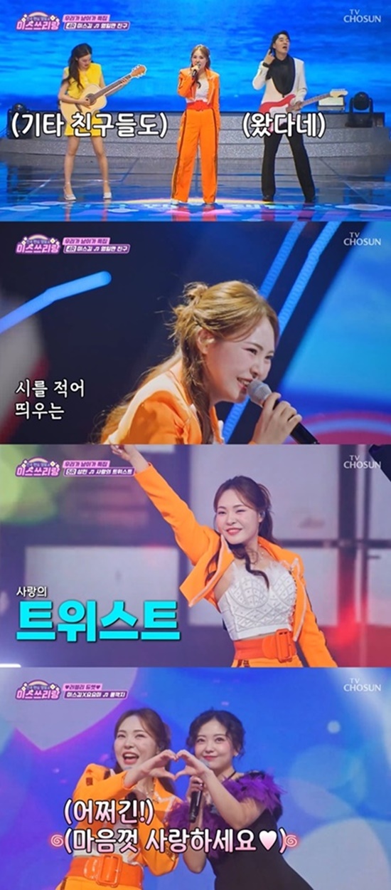 '사랑의 트위스트'에 맞춰 '미스쓰리랑'의 대표 댄서다운 흥이 넘치는 댄스 실력을 선보인 미스김과 정슬은 현장의 텐션을 뜨겁게 끌어올리며 활약했고, 성민은 두 사람의 에너지를 얻으며 오유진을 1점 앞서 승리를 거두게 됐다.