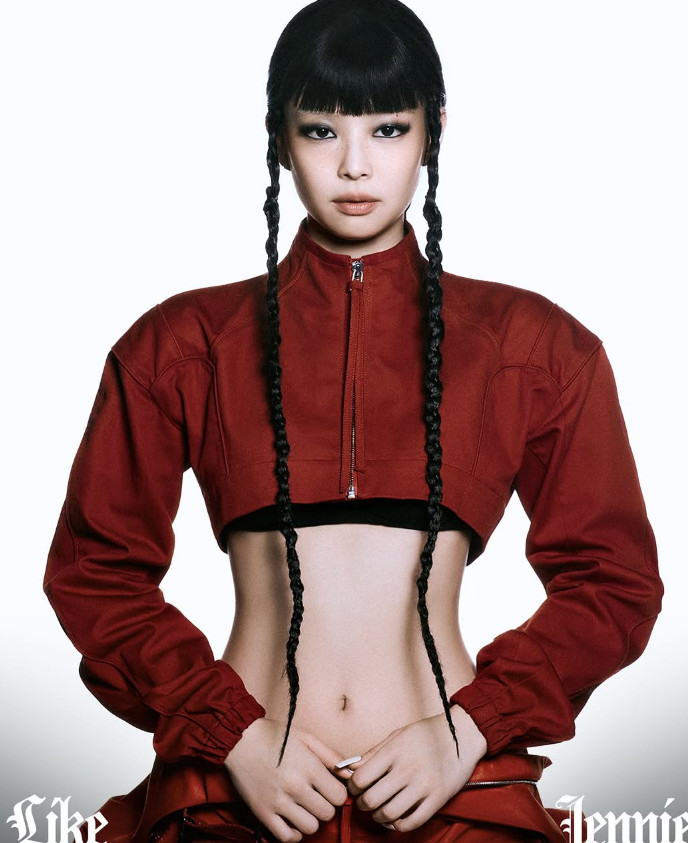 공개된 사진 속 제니는 날씨한 허리라인, S라인 몸매를 자랑하고 있다. 땋은 양갈래 머리를 한 채 스모키 메이크업을 해 힙한 매력을 드러냈다. 제니는 오는 7일 0시(한국시간) 공개되는 첫 번째 솔로 정규 앨범 'Ruby’(루비)의 타이틀곡 'Like JENNIE' 티저 영상을 지난 3일 공개했다. 해당 사진은 컴백 앨범 콘셉트 사진.